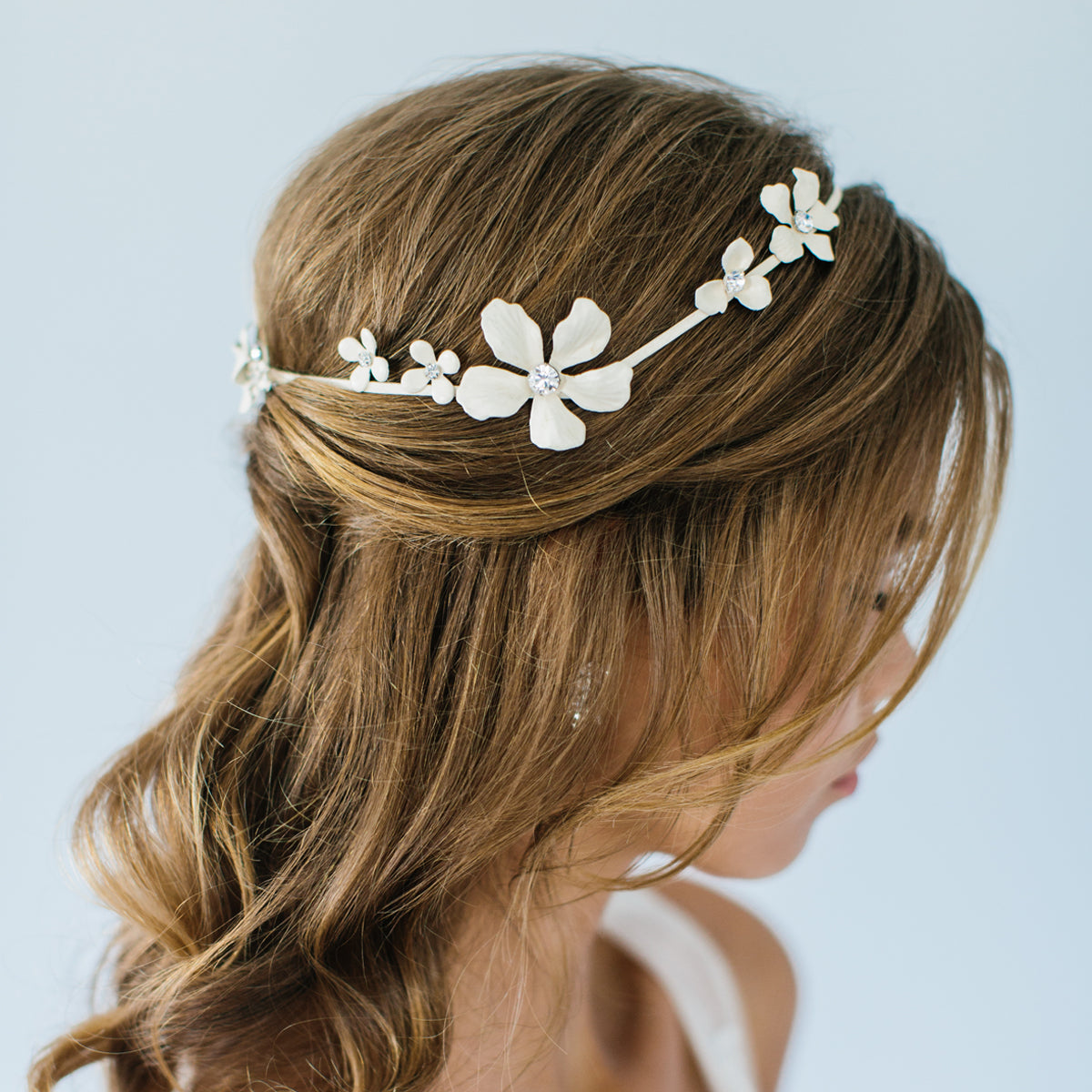 Description Our "Gardendale" accessory features hand painted porcelain floral details that will transform your wedding gown or hairstyle! It is finished with a double ivory satin ribbon that can be...