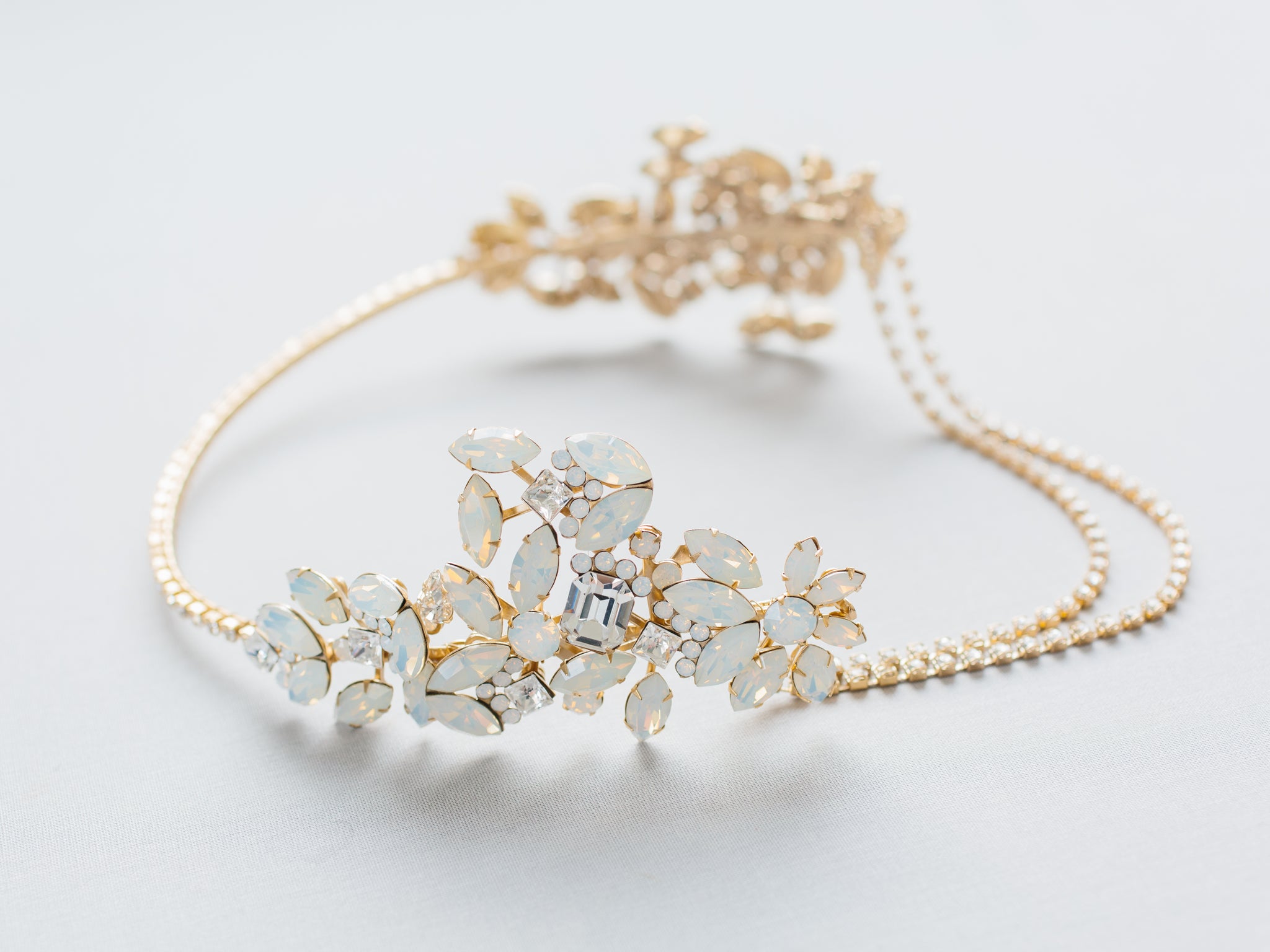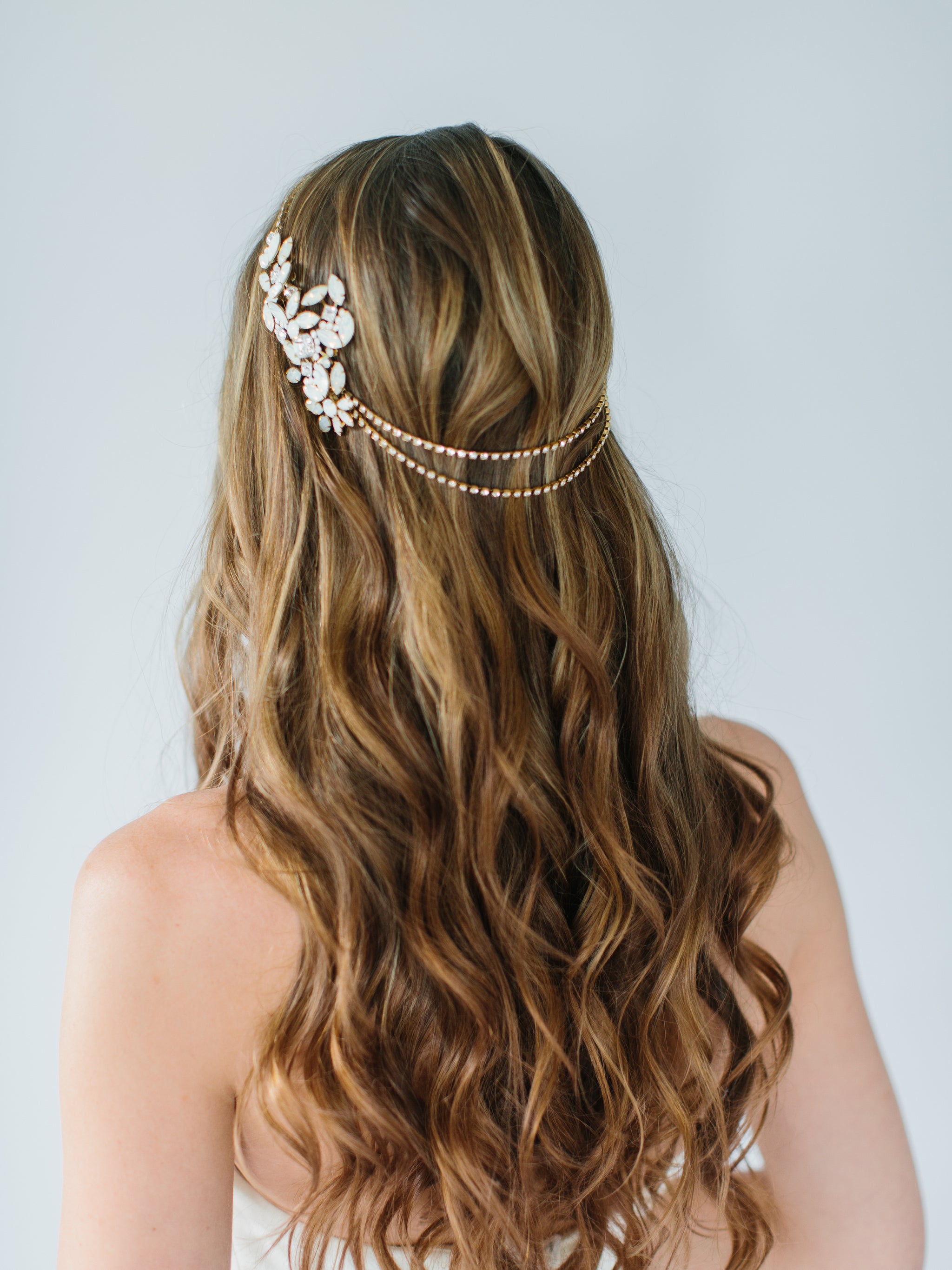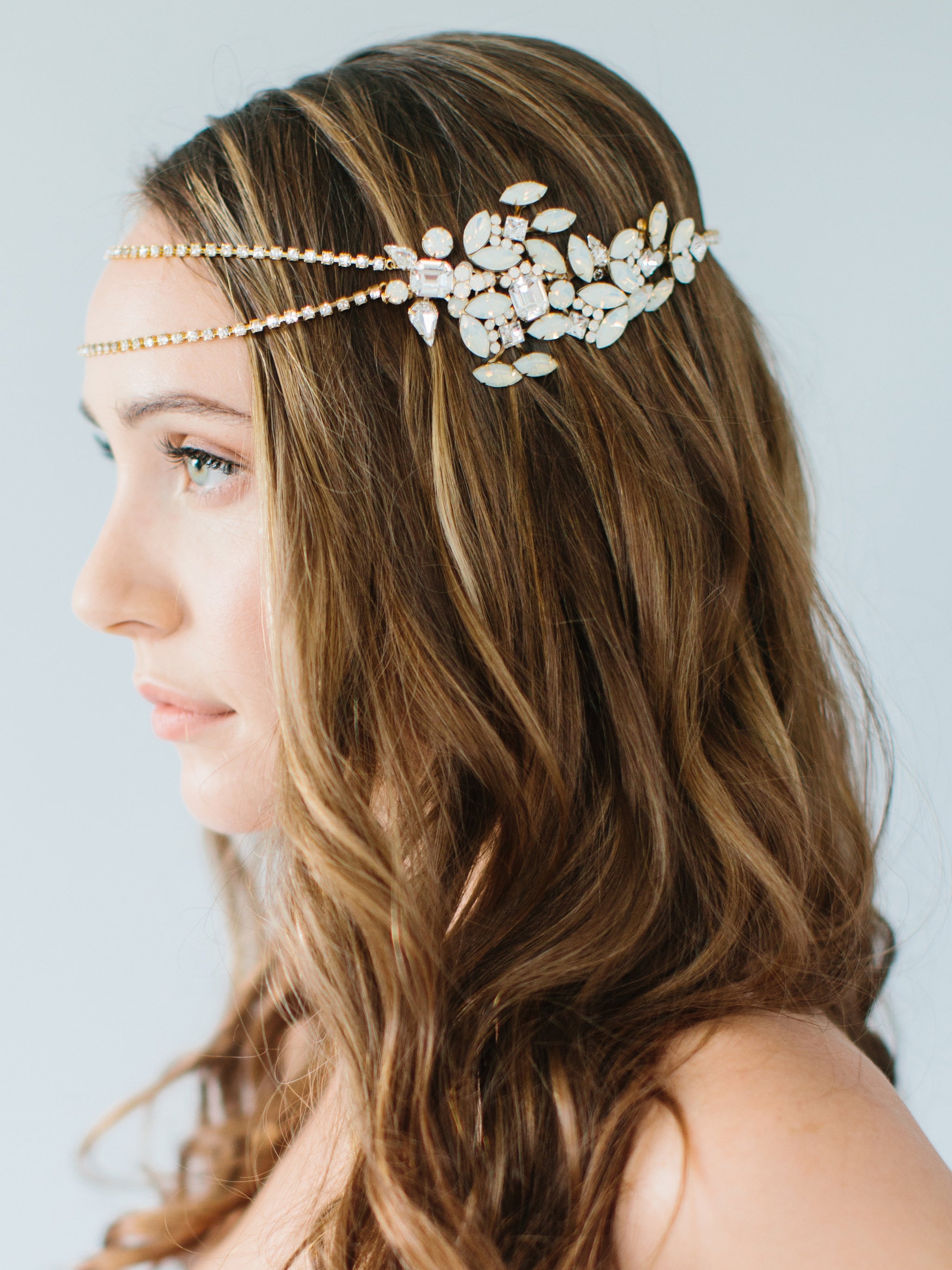 Our "Reine" headpiece is for the fashion bride wanting to make a statement. This accessory features white opal crystals for a touch of blue. It is also reversible and can be worn in various positions on the head for multiple looks on your wedding day!