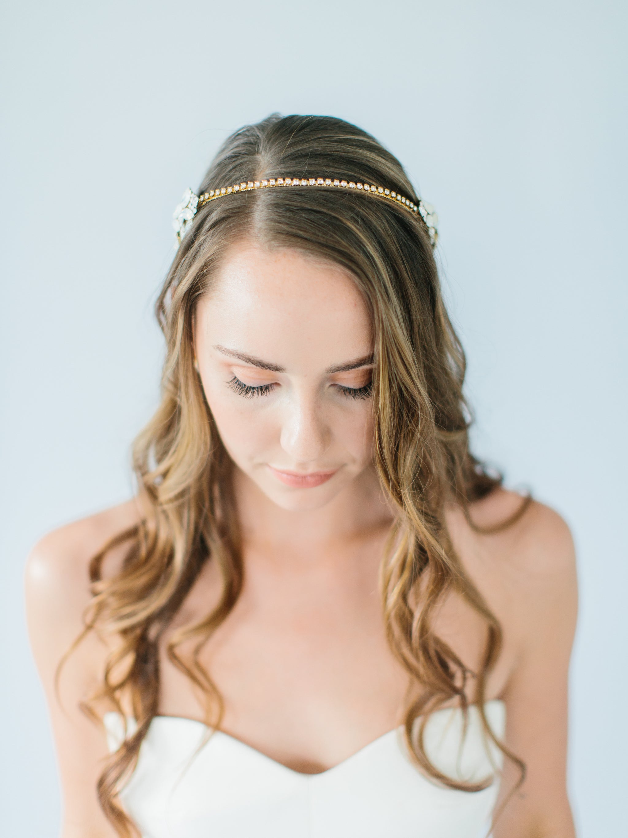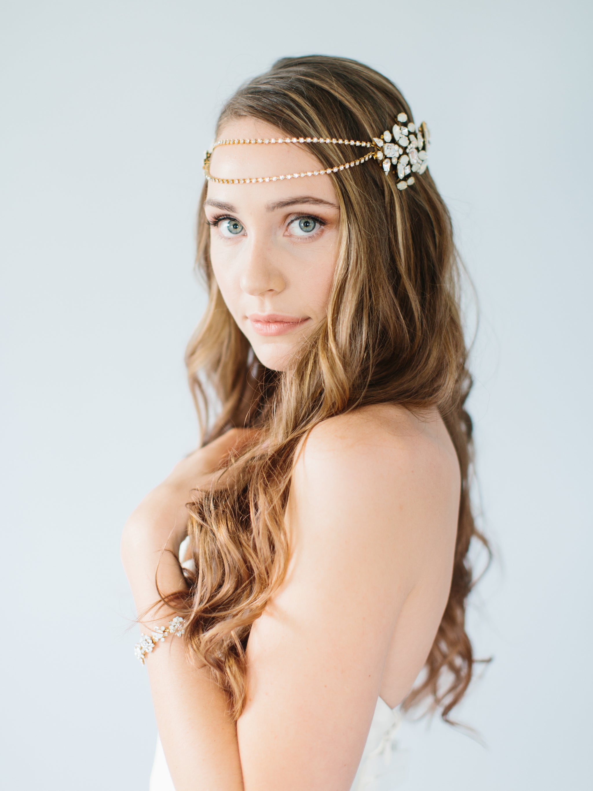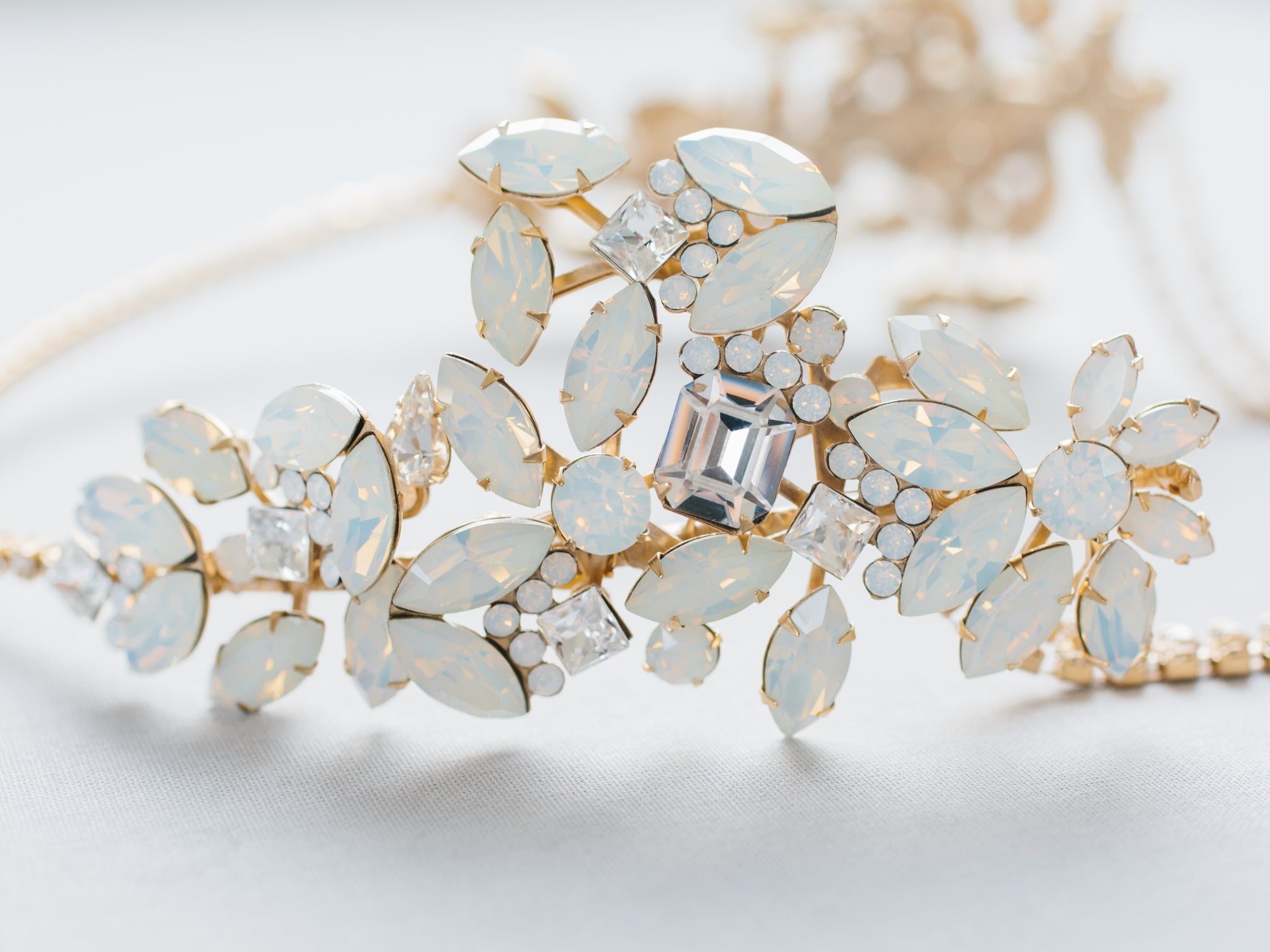 Our "Reine" headpiece is for the fashion bride wanting to make a statement. This accessory features white opal crystals for a touch of blue. It is also reversible and can be worn in various positions on the head for multiple looks on your wedding day!